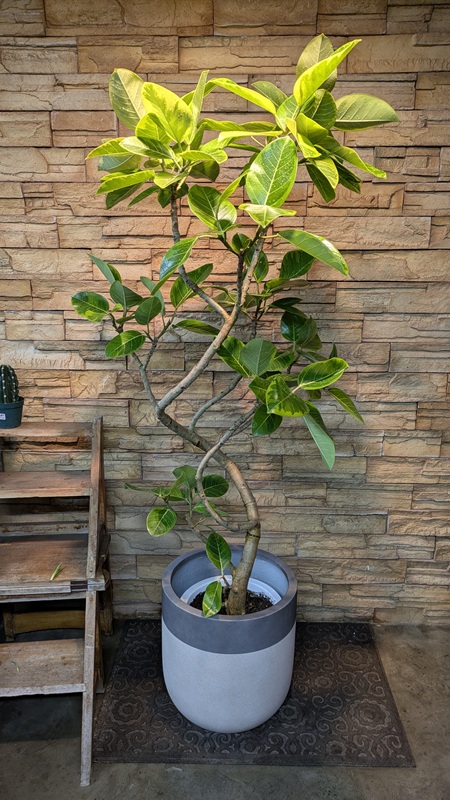 フィカス・アルテシマは淡いライムグリーンの斑に縁取られた明るい大きな葉が魅力で、背丈の大きな存在感のあるものがインテリアとして人気です。本来のアルテシマは緑色の葉をしていて、こちらはアルテシマ・バリエガータといって斑入りタイプのアルテシマです。