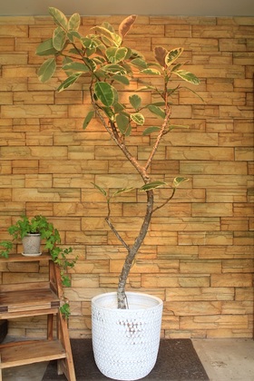 フィカス・ティネケは、周りにクリーム色の斑が入る品種のゴムの木です。光線でトップの葉は若干ピンク色に染まります。清潔感があり、さわやかな印象の観葉植物です。※鉢カバー別売り