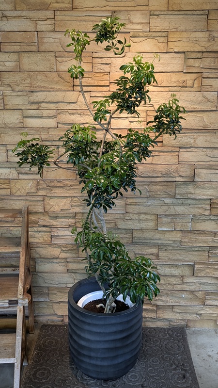 直立した茎に手のひらのような葉をつけます。名前の通り普通のシェフレラよりもコンパクトな葉が特徴で、成長もゆっくりです。植物の形があまり変わらない為、剪定も少ない頻度で済みます。