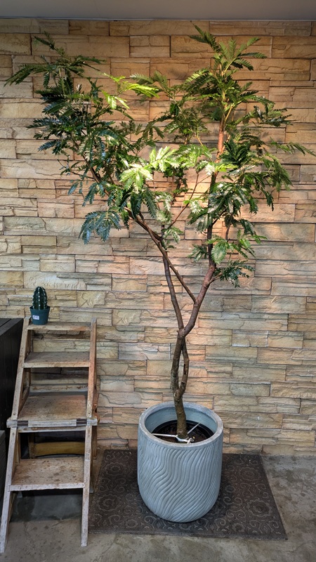 細かくさわやかなグリーンの葉がスタイリッシュなお部屋を演出してくれる観葉植物エバーフレッシュ。ネムノキと同じ仲間で、日が暮れると睡眠運動で葉を閉じます。大きくなると丸くてふわふわしたお花を咲かせることもあります。