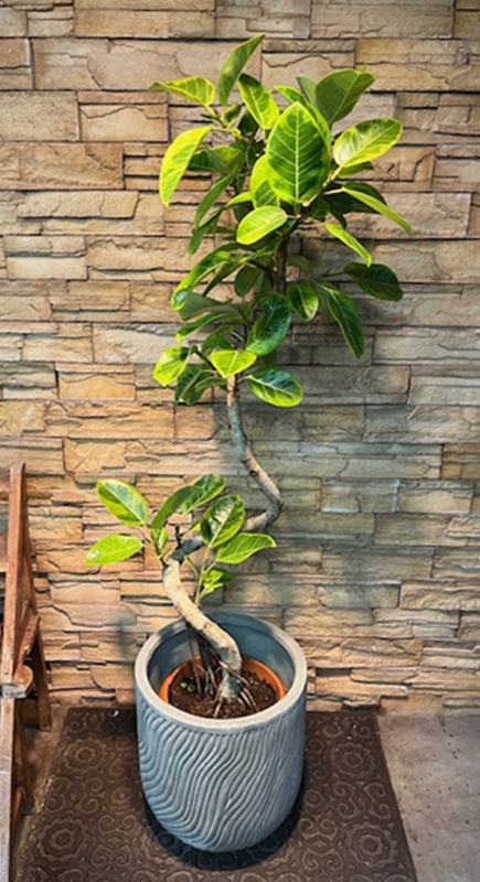 フィカス・アルテシマは淡いライムグリーンの斑に縁取られた明るい大きな葉が魅力で、背丈の大きな存在感のあるものがインテリアとして人気です。本来のアルテシマは緑色の葉をしていて、こちらはアルテシマ・バリエガータといって斑入りタイプのアルテシマです。