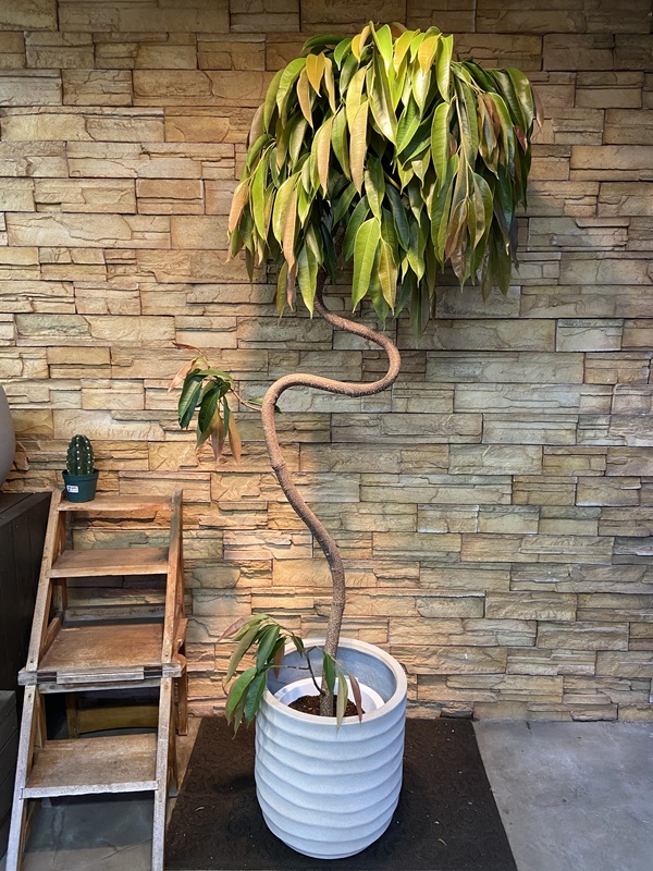 フィカス・アムステルダムキングは、明るいライトグリーンの葉で、細長く枝ごと下にたれる姿が一般的なゴムノキと違う趣がある観葉植物です。ショウナンゴムノキに似ていますが、ヨーロッパでは広葉のこちらの品種の方が広く知られています。