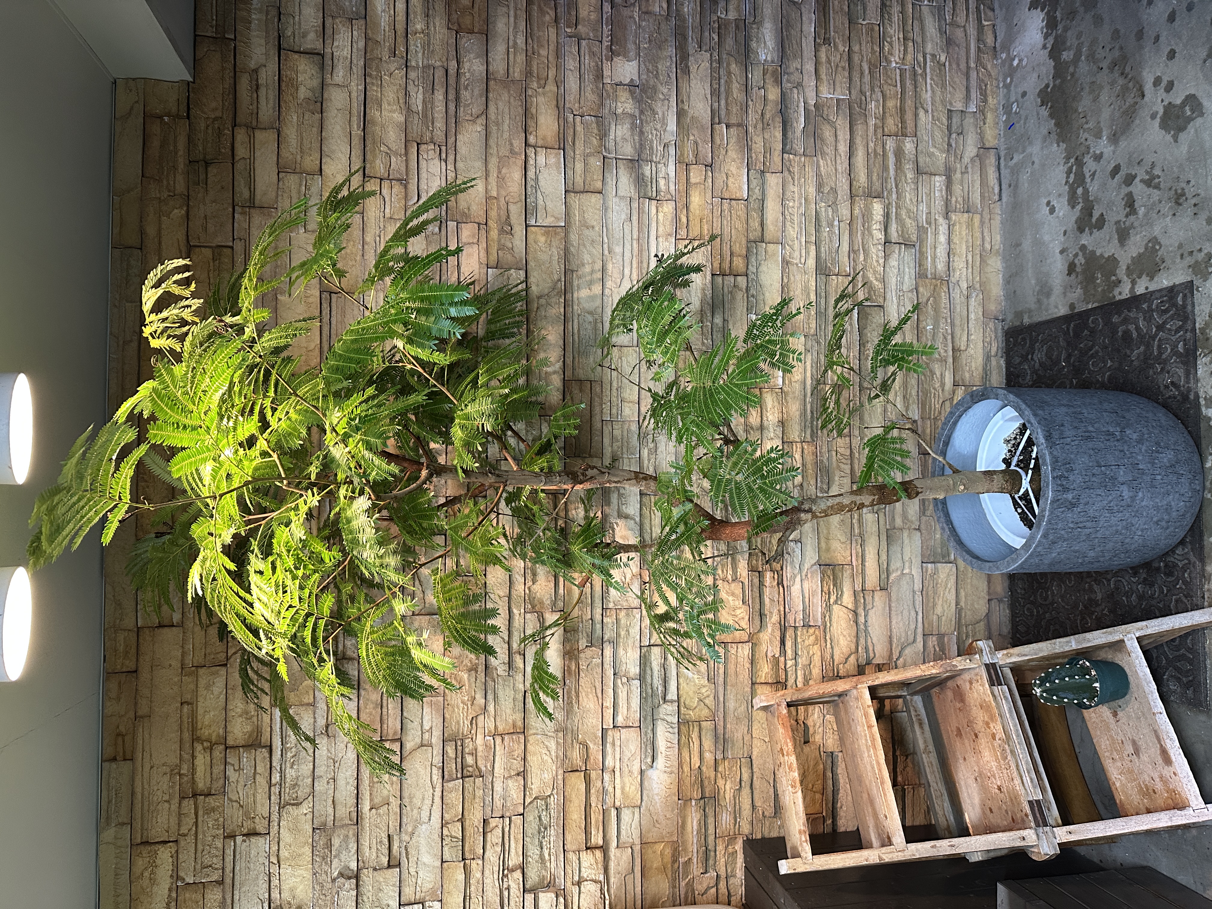 細かくさわやかなグリーンの葉がスタイリッシュなお部屋を演出してくれる観葉植物エバーフレッシュ。ネムノキと同じ仲間で、日が暮れると睡眠運動で葉を閉じます。大きくなると丸くてふわふわしたお花を咲かせることもあります。