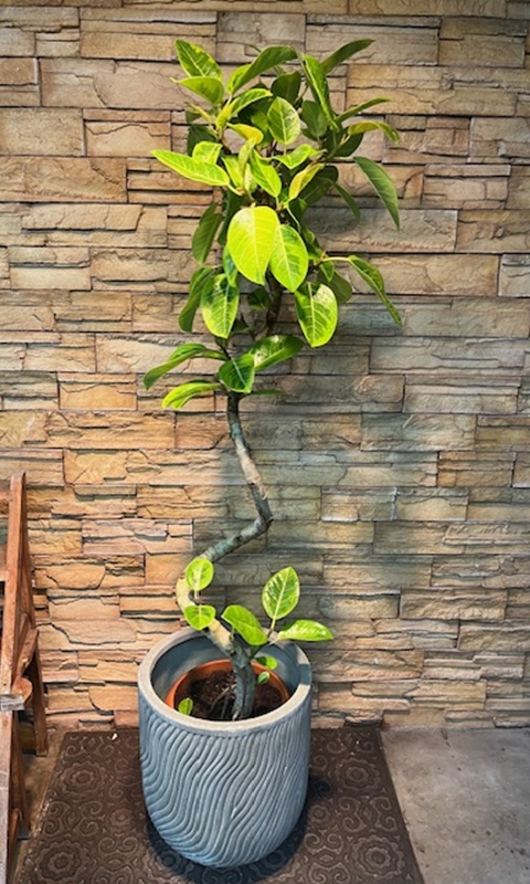 フィカス・アルテシマは淡いライムグリーンの斑に縁取られた明るい大きな葉が魅力で、背丈の大きな存在感のあるものがインテリアとして人気です。本来のアルテシマは緑色の葉をしていて、こちらはアルテシマ・バリエガータといって斑入りタイプのアルテシマです。