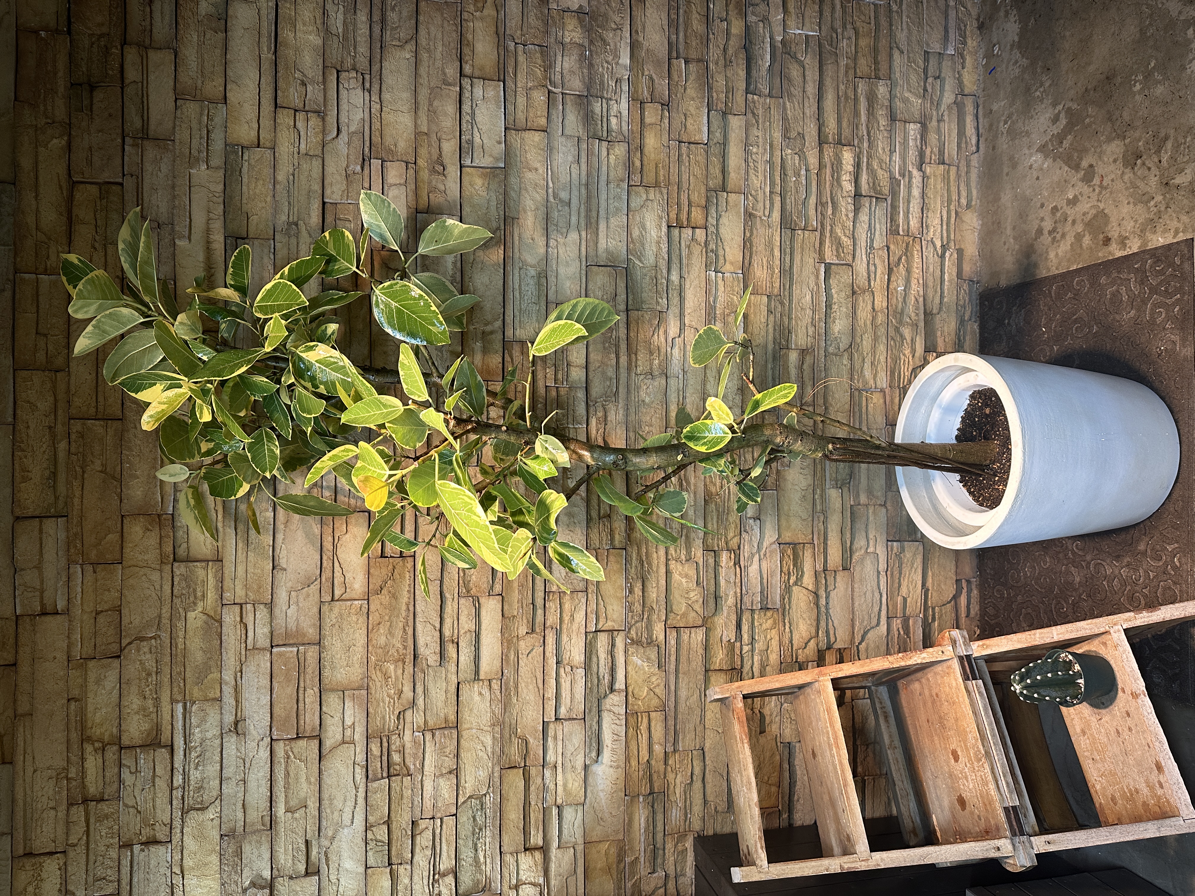 フィカス・アルテシマは淡いライムグリーンの斑に縁取られた明るい大きな葉が魅力で、背丈の大きな存在感のあるものがインテリアとして人気です。本来のアルテシマは緑色の葉をしていて、こちらはアルテシマ・バリエガータといって斑入りタイプのアルテシマです。