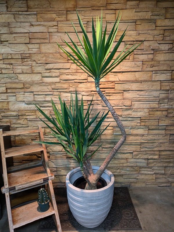 ユッカ・エレファンティペスはワイルドで力強い雰囲気が魅力の観葉植物です。剣のようなシャープな葉が、未来に向かって元気に力強く伸びていく若者にたとえ、青年の木とも呼ばれています。また、エレファンティペスというのは、大きくなった幹の根元が、象の足のように見えるからだそうです。