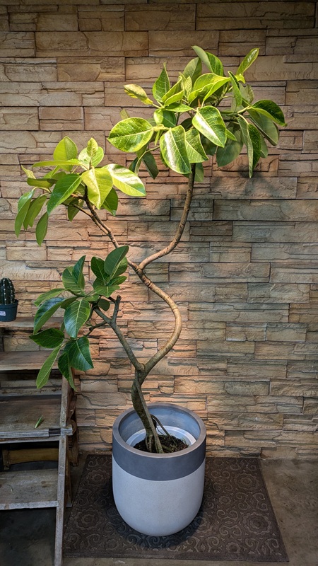 フィカス・アルテシマは淡いライムグリーンの斑に縁取られた明るい大きな葉が魅力で、背丈の大きな存在感のあるものがインテリアとして人気です。本来のアルテシマは緑色の葉をしていて、こちらはアルテシマ・バリエガータといって斑入りタイプのアルテシマです。