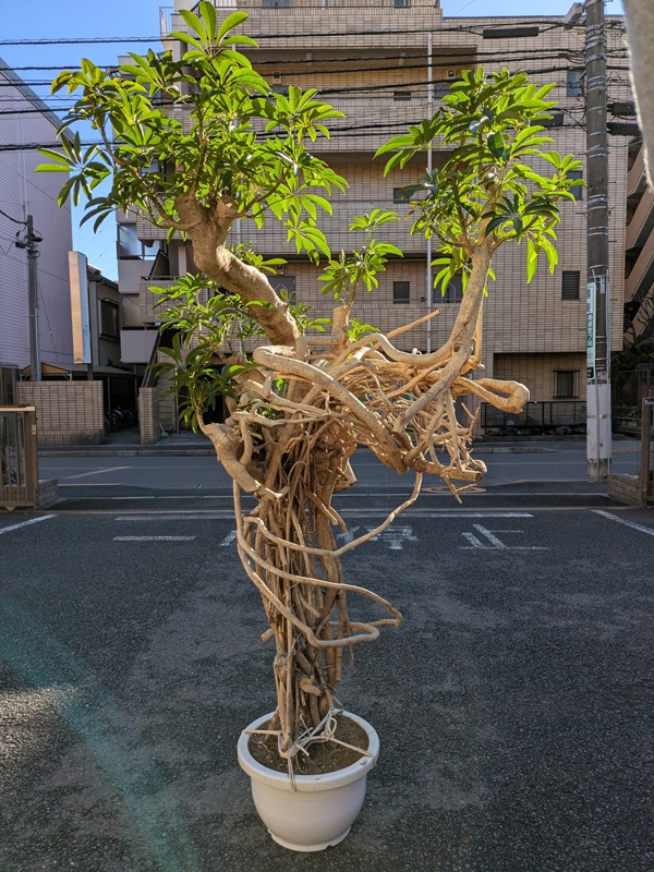 直立した茎に手のひらのような葉をつけます。よく「カポック」の名前で流通していますが、カポックとは別の植物です。寒さに強く育てやすいので、初心者の方にもおすすめです。