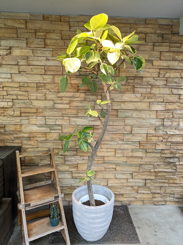 フィカス・アルテシマは淡いライムグリーンの斑に縁取られた明るい大きな葉が魅力で、背丈の大きな存在感のあるものがインテリアとして人気です。本来のアルテシマは緑色の葉をしていて、こちらはアルテシマ・バリエガータといって斑入りタイプのアルテシマです。