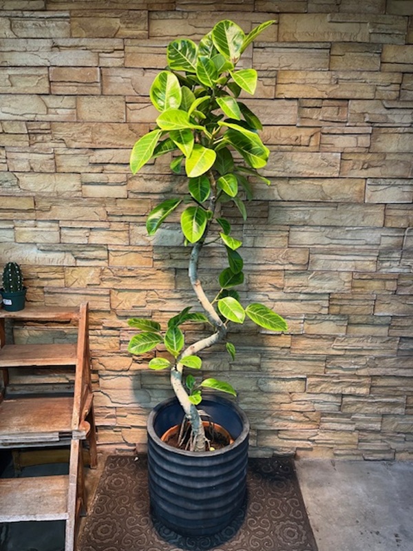 フィカス・アルテシマは淡いライムグリーンの斑に縁取られた明るい大きな葉が魅力で、背丈の大きな存在感のあるものがインテリアとして人気です。本来のアルテシマは緑色の葉をしていて、こちらはアルテシマ・バリエガータといって斑入りタイプのアルテシマです。