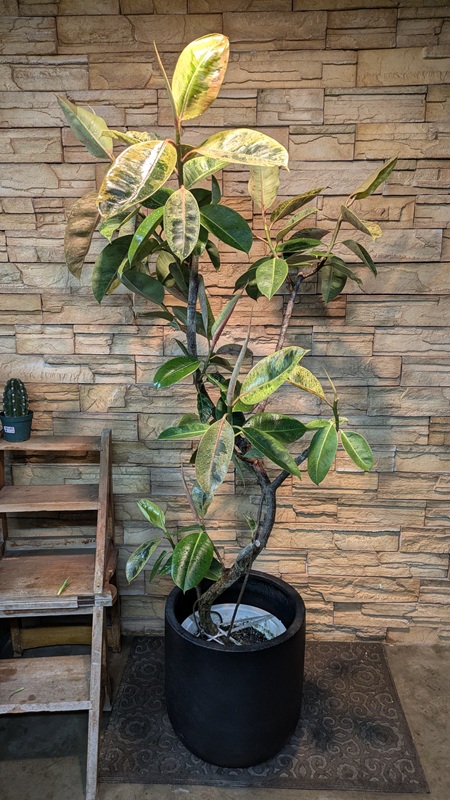 フィカス・ジンは、わりかし成長が遅い方で、特に大きいサイズでは、あまり流通しない珍しいゴムの木です。新しい葉は、イエローからライトグリーンをベースに、まだらにグリーンが散らばります。独特の斑が美しい品種の観葉植物です。