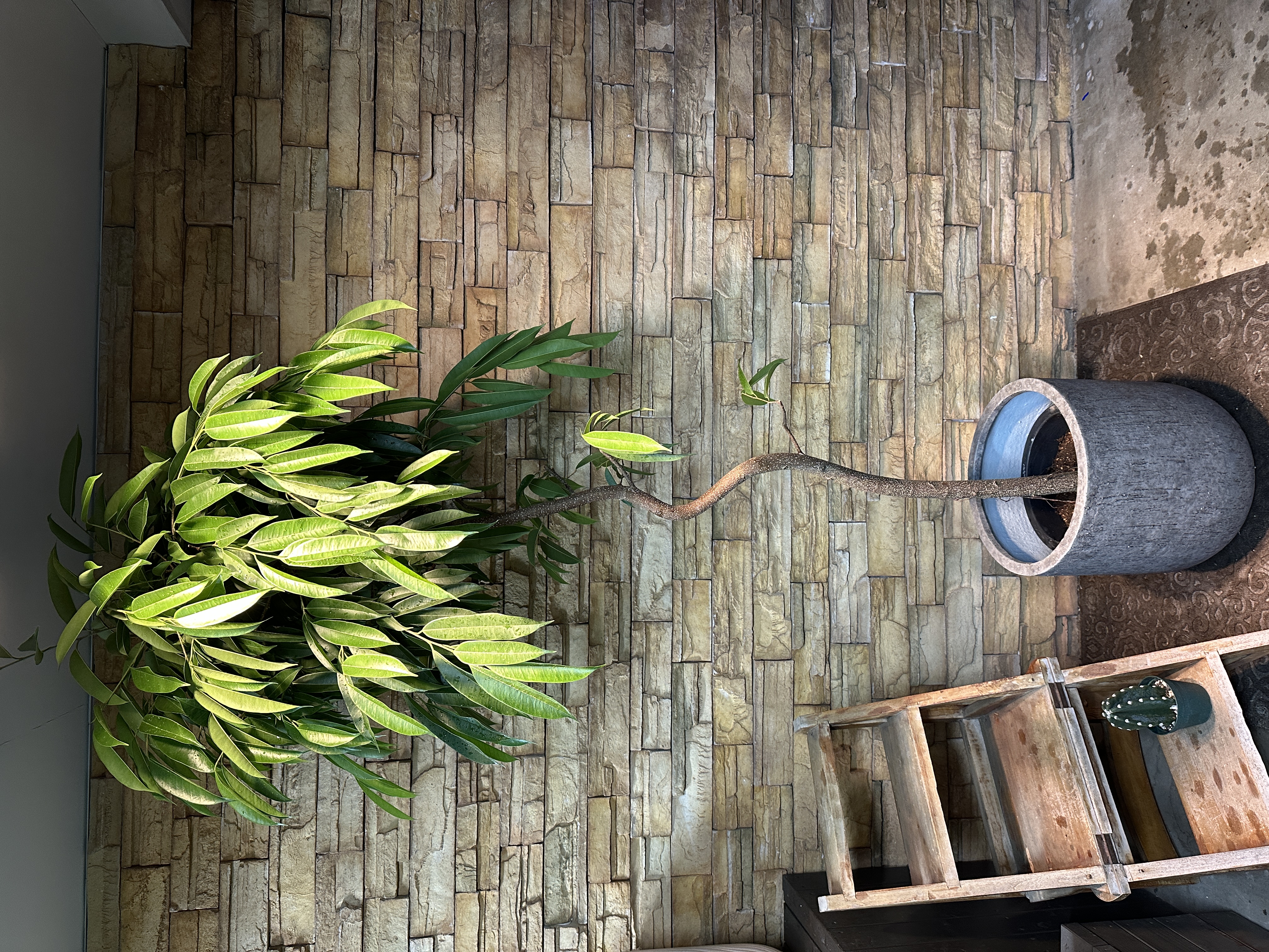 フィカス・アムステルダムキングは、明るいライトグリーンの葉で、細長く枝ごと下にたれる姿が一般的なゴムノキと違う趣がある観葉植物です。ショウナンゴムノキに似ていますが、ヨーロッパでは広葉のこちらの品種の方が広く知られています。