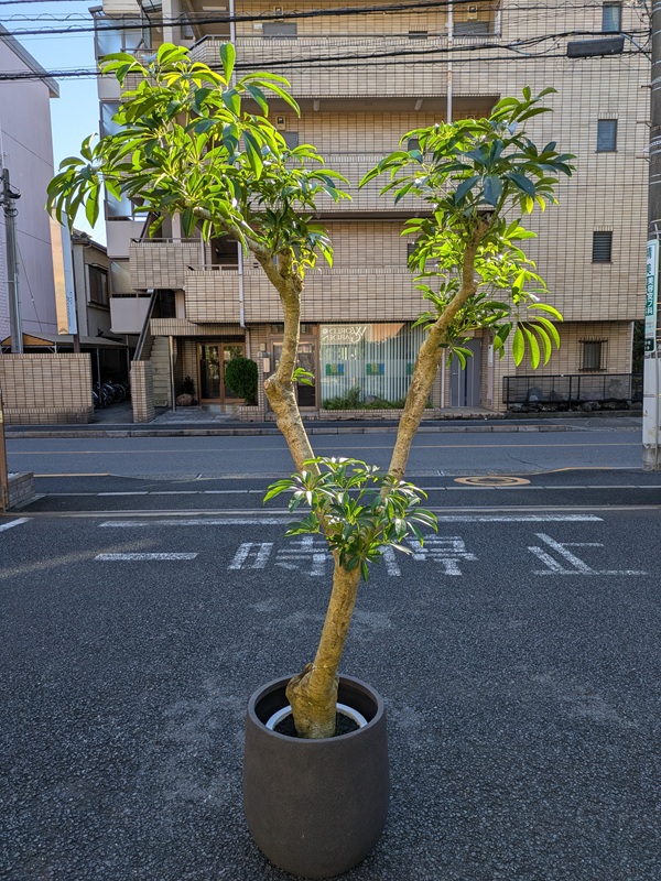 直立した茎に手のひらのような葉をつけます。よく「カポック」の名前で流通していますが、カポックとは別の植物です。寒さに強く育てやすいので、初心者の方にもおすすめです。