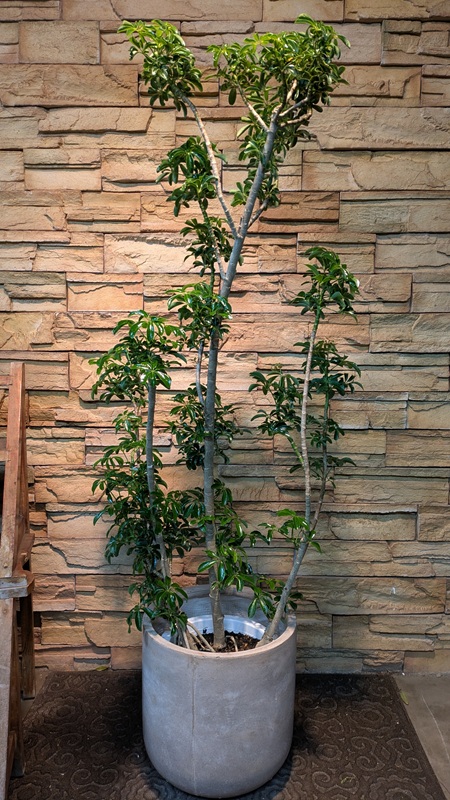 直立した茎に手のひらのような葉をつけます。名前の通り普通のシェフレラよりもコンパクトな葉が特徴で、成長もゆっくりです。植物の形があまり変わらない為、剪定も少ない頻度で済みます。