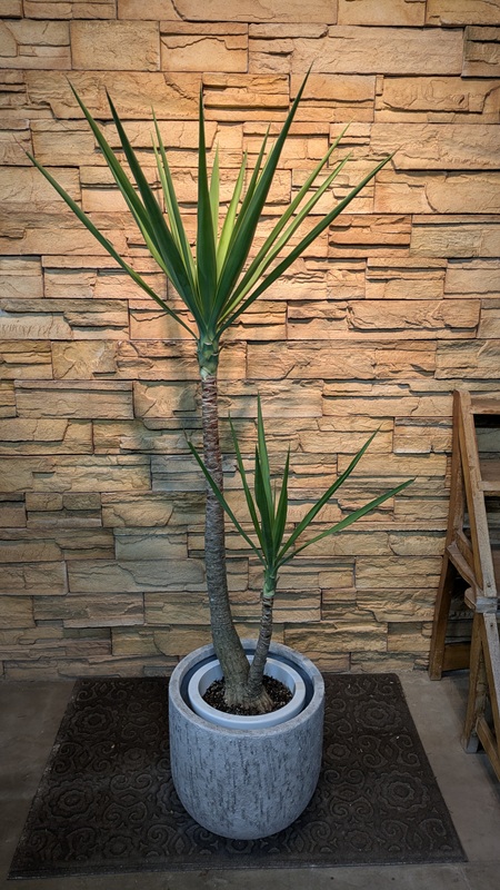 ユッカ・エレファンティペスはワイルドで力強い雰囲気が魅力の観葉植物です。剣のようなシャープな葉が、未来に向かって元気に力強く伸びていく若者にたとえ、青年の木とも呼ばれています。また、エレファンティペスというのは、大きくなった幹の根元が、象の足のように見えるからだそうです。